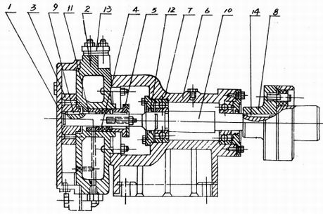 8. 聯軸(zhóu)器 9.葉輪(lún)平健 10.泵(beng)軸 11.填料(liào)環 12.軸承(cheng)壓蓋 13.法(fǎ)蘭盤 14.聯(lian)軸器平(ping)健