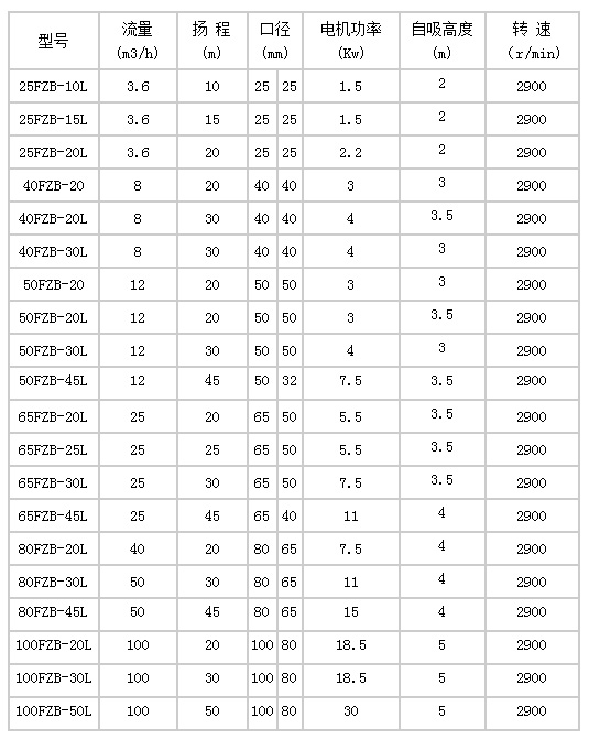 技(ji)術參數: FZB型氟塑(sù)料自吸化工泵(beng)